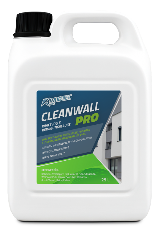 CLEANWALL PRO ist eine gebrauchsfertige Reinigungslauge für mineralische und gestrichene Fassadenoberflächen. Durch seine oxidativ wirkenden Aktivkomponenten entfernt das Produkt zuverlässig organische Verschmutzungen, Alge, dunkle Beläge uvm.